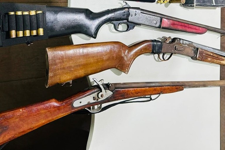 De acordo com a polícia, ao chegarem à propriedade indicada, os agentes encontraram um automóvel e dois funcionários na área externa. Com autorização deles, foi feita uma busca no interior da residência, onde foi localizada uma arma de fogo no chão de um dos cômodos. Além disso, foram apreendidas duas espingardas, um simulacro de arma de fogo e estojos deflagrados.