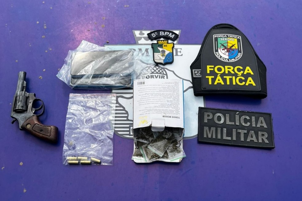 Durante a ação, a polícia apreendeu um revólver com munições deflagradas e intactas, além de 26 embalagens tipo zip lock contendo maconha.