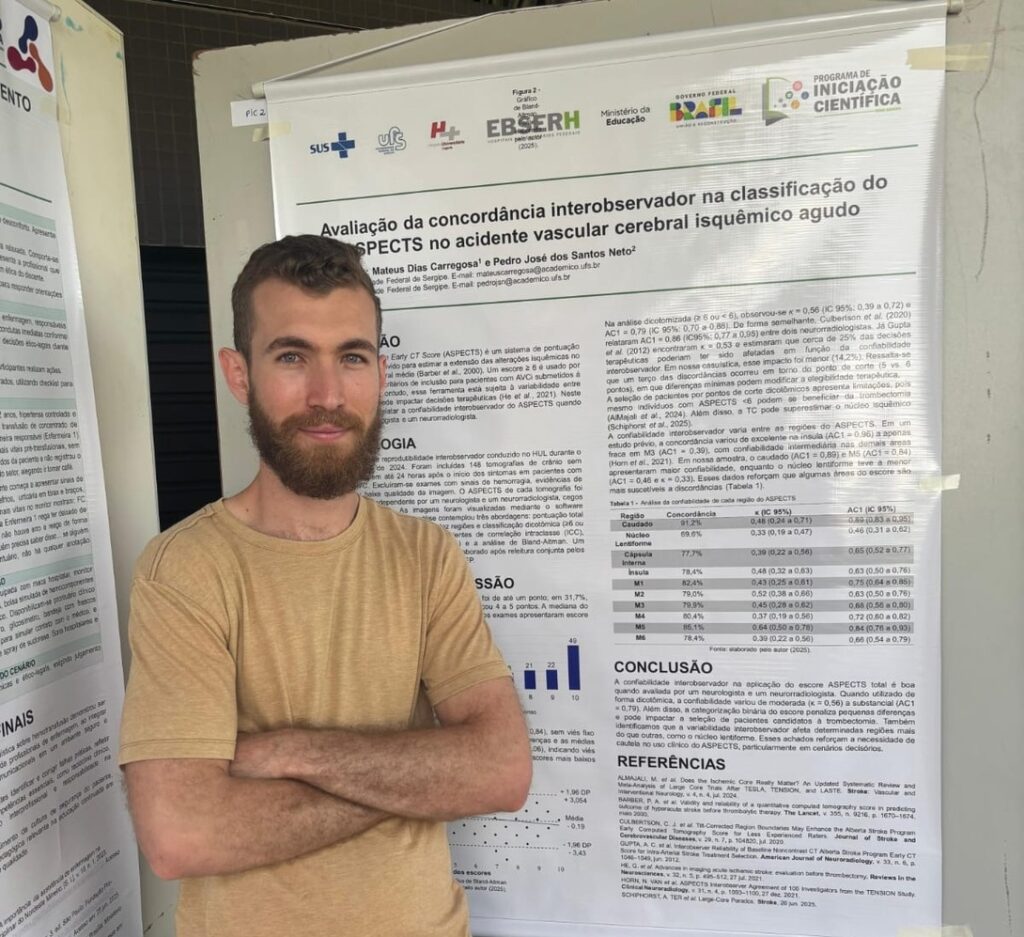 O estudante de Medicina do campus Lagarto da Universidade Federal de Sergipe (DMEL/UFS), Mateus Carregosa, foi destaque em uma premiação nacional promovida pela Empresa Brasileira de Serviços Hospitalares (Ebserh). O discente conquistou o terceiro lugar no Webinário de Iniciação Científica e Tecnológica da Ebserh, com o estudo intitulado “Avaliação da concordância interobservador na classificação do Aspects no acidente vascular cerebral isquêmico agudo”.