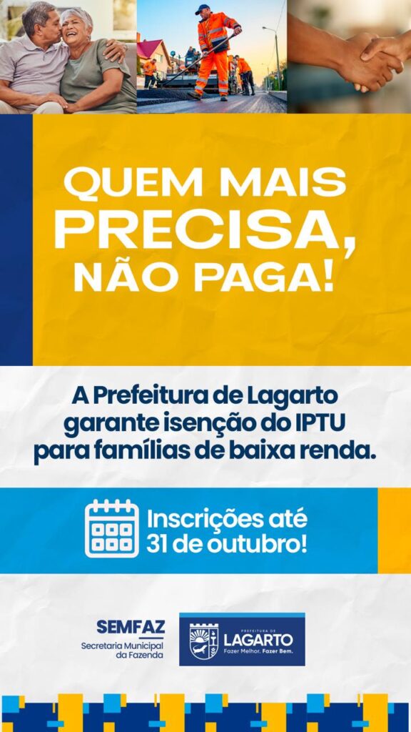 Buscando facilitar a vida dos contribuintes que têm direito à isenção de pagamento do Imposto Predial e Territorial Urbano (IPTU), para o exercício de 2026, a Prefeitura Municipal de Lagarto (PML), através da Secretaria Municipal da Fazenda (Semfaz), montou uma estratégia, nesta última semana do prazo para solicitação, até a sexta-feira, 31, de atendimento itinerante em alguns bairros da cidade. A iniciativa de intensificar a realização do serviço começou nesta terça-feira, 28, na Clínica de Saúde Davi Marcos de Lima, bairro São José, entre 14h e 16h.