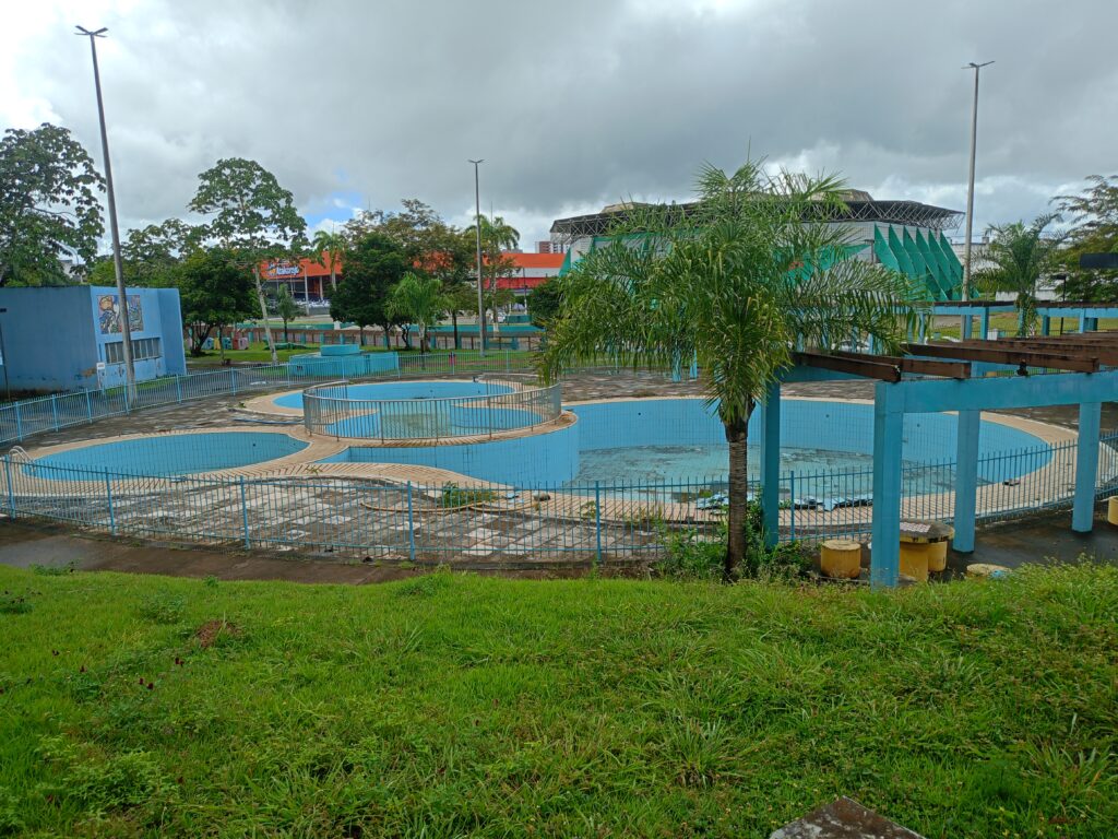 Um vídeo gravado por um frequentador mostra a situação crítica das piscinas e das estruturas do balneário. O local, que recebia crianças e adultos diariamente, está sem condições adequadas de uso, gerando preocupação entre os moradores.