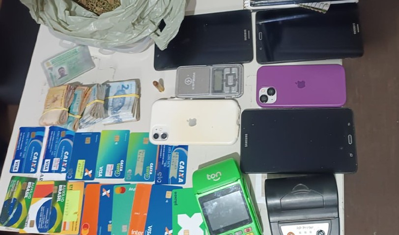 Ao localizar o suspeito, os policiais encontraram entorpecentes, dinheiro e diversos cartões bancários pertencentes a terceiros. As equipes seguiram com as buscas até a residência do indivíduo, onde foram apreendidos mais cartões, anotações de cobrança, uma balança de precisão, uma munição e outra porção de droga.