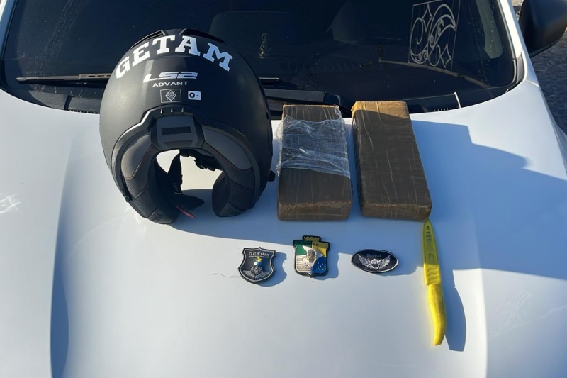 Durante a revista no automóvel, os militares localizaram dois tabletes de maconha, totalizando aproximadamente 2 kg da droga.