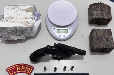 Com o homem, os policiais apreenderam um revólver calibre .32 com numeração suprimida, seis munições, além de porções de maconha e cocaína. Após consulta aos sistemas de segurança, foi constatado que havia um mandado de prisão em aberto contra o suspeito.