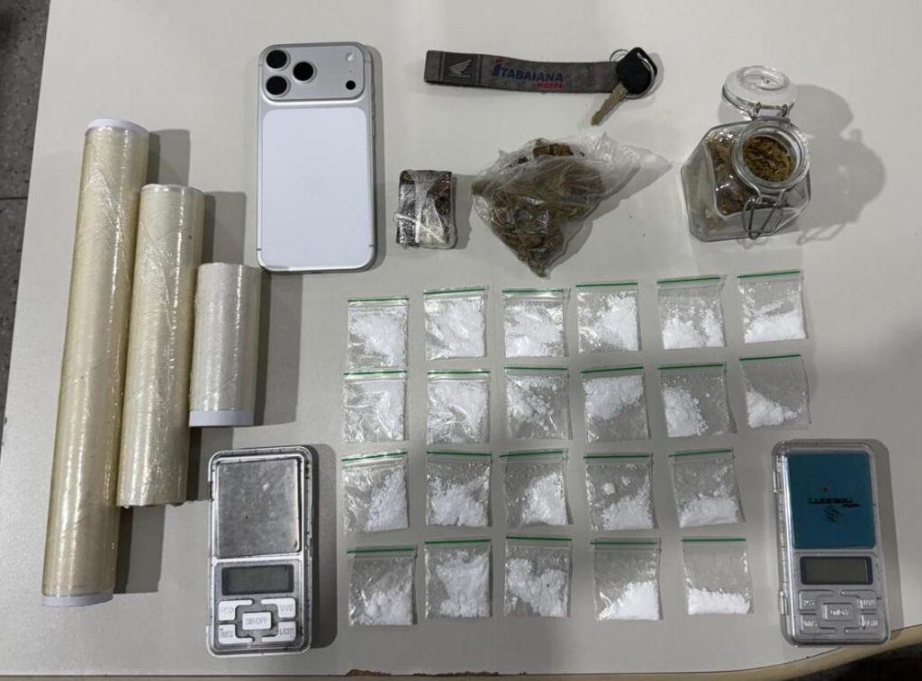 Em um dos quartos, foram apreendidos 22 invólucros de substância semelhante à cocaína e cerca de 24 gramas de maconha do tipo flor. Na cozinha, os agentes localizaram mais duas porções de maconha, uma do tipo flor e outra prensada, pesando aproximadamente 12 e 19 gramas.