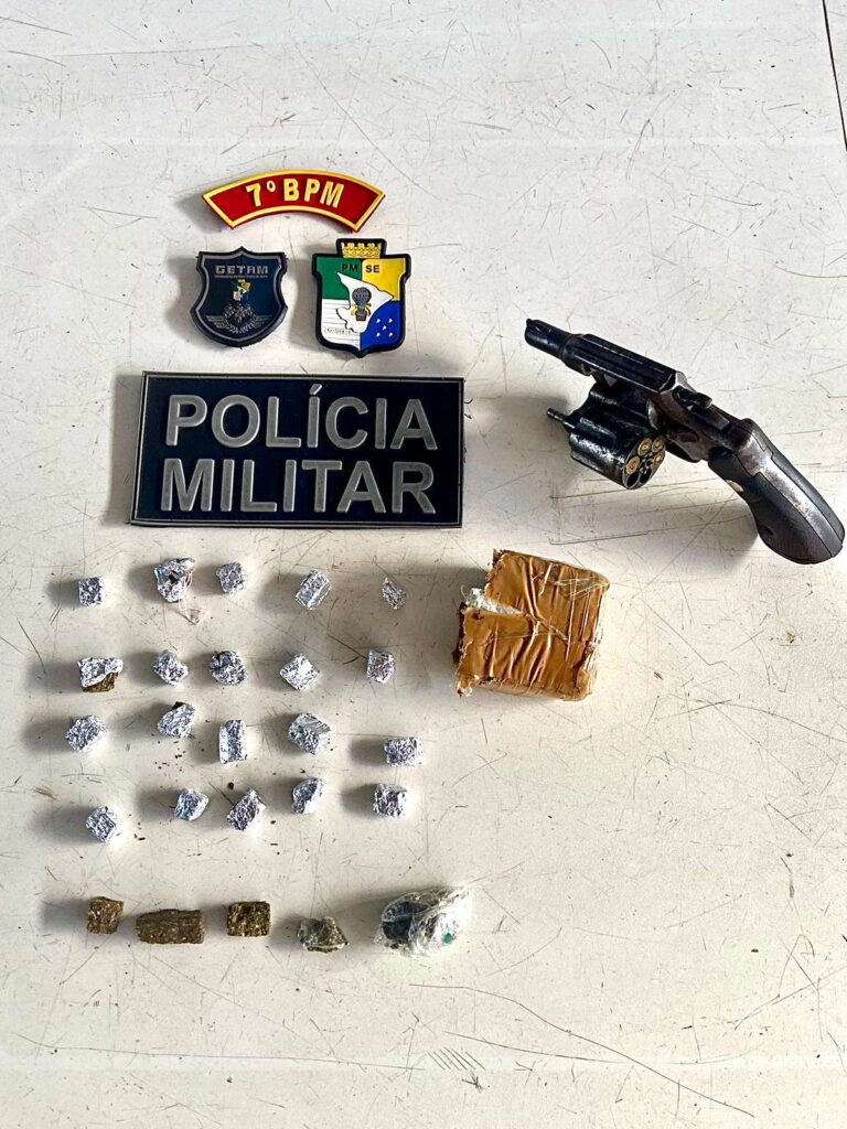 Com o suspeito foram apreendidos um revólver calibre 38, um tablete e 24 porções fracionadas de substância análoga à maconha, prontas para comercialização.